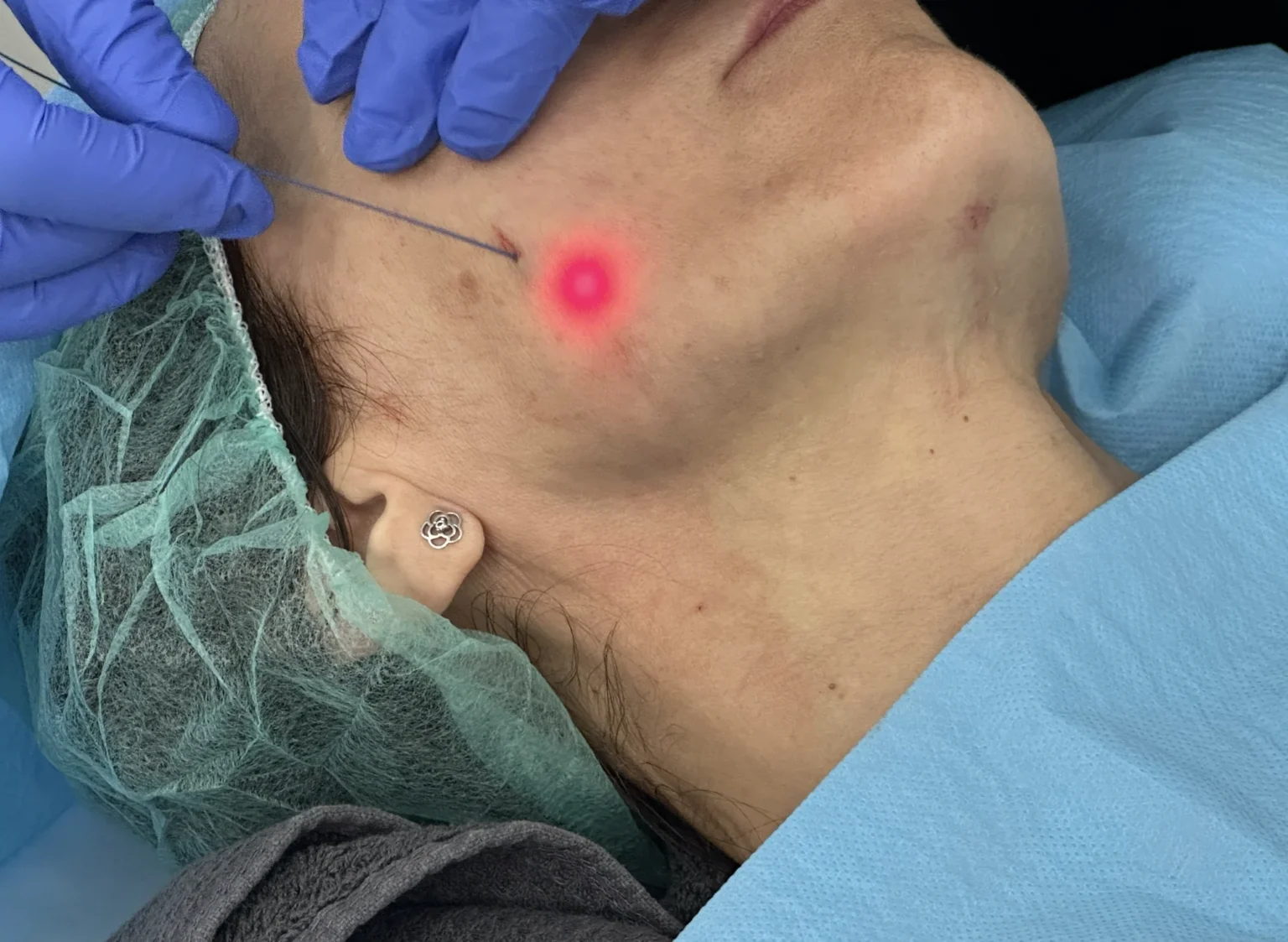 - Inserción de la fibra en la hipodermis y realización de movimientos en abanico para distribución uniforme del láser.
