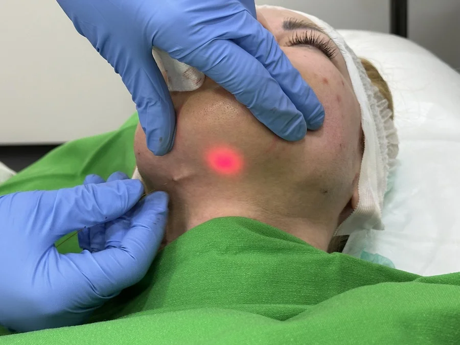 - Procedimientos de desinfección, marcaje de áreas a tratar y anestesia tópica según tolerancia del paciente.